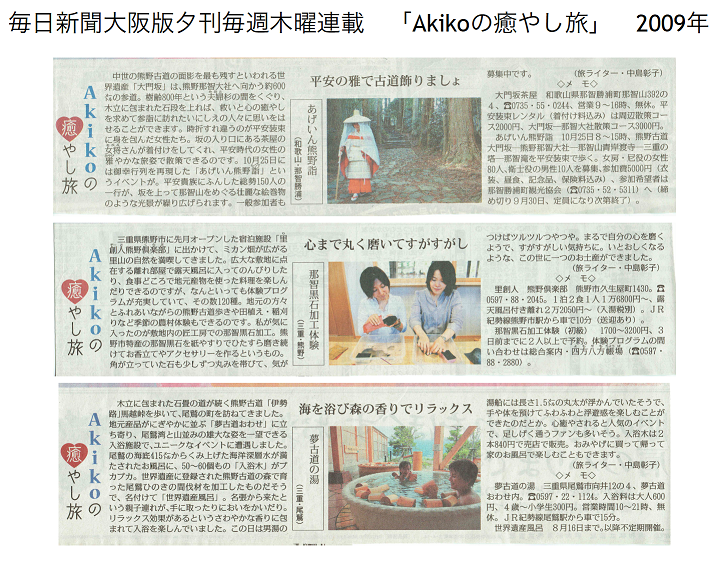 お仕事 仕事一覧(プランニングケイでの仕事実績含む) ●るるぶ『和歌山』 るるぶ『和歌山』 1999年発行号より現在まで毎年号担当 ●るるぶ『南紀伊勢志摩』、るるぶ『高野山』 ●地域別シリーズ るるぶ情報版『京都』『奈良』『京都奈良』『奈良を歩こう』『伊勢』『山口』『大分別府』『湯布院黒川』『山陽山陰中国』『兵庫』『岐阜』ほか多数 ●目的別シリーズ るるぶ情報版『温泉&宿 中国四国』『温泉&宿 関西周辺』『ドライブ関西』『こどもとあそぼ! 関西』『週末小旅 関西周辺』『ドライブ九州』ほか ●MOOK・各種書籍・冊子 日本遺産 絶景の宝庫 『和歌の浦』 『播磨の麹文化 ガイドブック』 るるぶ特別編集『わかやま漁港』改訂版 るるぶ『真田丸』 『歩いて楽しむ神戸』 ココミル『南紀熊野古道』『伊勢』改訂版 るるぶキッチン タビリエ『南紀・熊野古道』 タビハナ『神戸』『南紀白浜』 楽々『伊勢志摩』『松江出雲鳥取』 ラフィーテ『広島・宮島・松江・出雲』 ほか ●連載・取材撮影・執筆歴 月刊誌『ノジュール』 JTBパブリッシング 毎日新聞 夕刊大阪版 『Akikoの旅のお取り寄せ帖』『Akikoの旅で元気に!』『Akikoの癒やし旅』 四国新聞生活情報誌オアシス 『おいしい旅』『湯るり旅』 ウォーカームック『和歌山Walker』 KADOKAWA DYNAC(SUNTORY GROUP) 社内広報誌 常陽新聞社 企画室 『ひと』インタビュー記事連載 茨城リビング新聞社『あいリビング』編集部 副編集長 ●講師・ゲストスピーカー 講演歴 『温泉観光実践士養成講座』紀泉温泉修験道 『はなみずきキャリア塾』 大阪府男女共同参画推進財団 『転職カフェ』 とよなか男女共同参画推進センターすてっぷ ほか